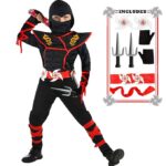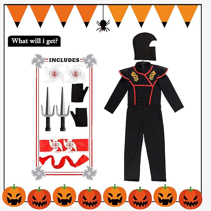 - **High-Quality Ninja Suit**: Made from durable, stretchable fabric for maximum comfort and flexibility. - **Full Coverage Design**: Includes a hood, face mask, and black tunic with pants for a classic ninja look. - **Enhanced Accessories**: Comes with professional-grade foam weapons like a katana, nunchucks, and shuriken. - **Protective Gear**: Features arm and leg guards for an authentic and complete ninja appearance. - **Ideal for Various Uses**: Perfect for cosplay, martial arts demonstrations, Halloween, and themed events. - **Easy Care**: Simple to wash and maintain, ensuring long-lasting wear.