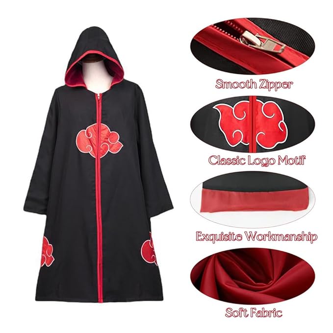 – **Design**: A long, black cloak with a high collar, featuring the iconic red clouds outlined in white, which are the signature symbols of the Akatsuki organization. The cloak usually has a zipper or button closure in the front.